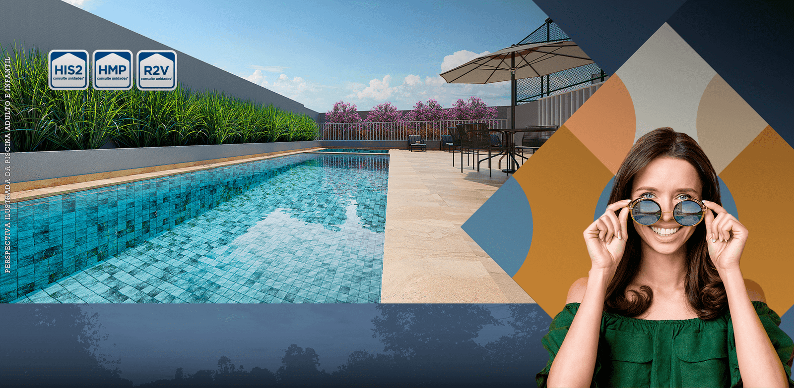 Tipologia 2 dormitórios e terraço – 39m² – 46 unidades (tipo D e E) / 2 dormitórios e terraço – 40m² – 46 unidades (tipo F e G) / 2 dormitórios e terraço – 38m² – 46 unidades (tipo H)